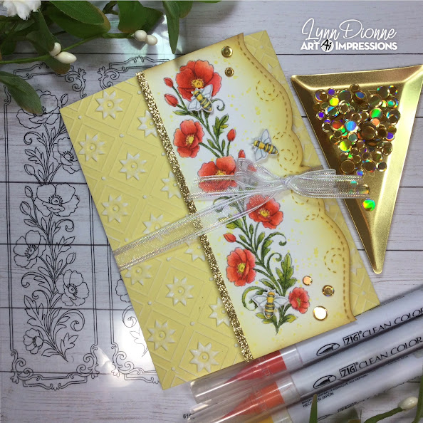 Take a look at this gorgeous card from Lynn! It’s a gatefold card with an ornate twist that has a swirly die lower flap edge, stunning flowers, nice texture and a few touches of gold. For the bottom she began with yellow cardstock, operating it via a big dry embossing folder, swiping white ink on the increase areas after which folding it for the gatefold fashion base. For the highest flap she masked off a bookmark stamp, simply leaving the row of fairly Poppy flowers and stamped them on a die lower wavy panel edge, coloring them with Zig Clear Colour Markers. She additionally stamped and added some little bees and a strip of gold glitter paper together with gold gems.