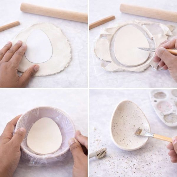 Roll your clay and reduce a delicate egg form — barely wider on the backside and gently tapered on the high. Form it over a bowl so the centre dips simply sufficient to carry jewelry with out tipping it out.