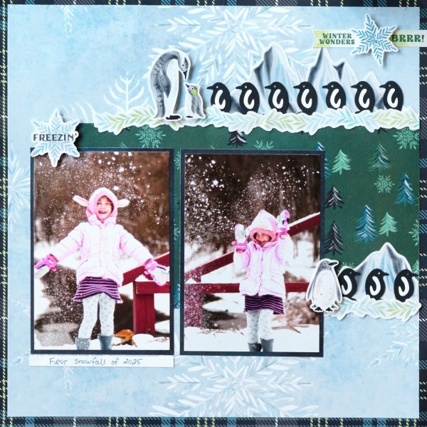 Karyn’s enjoyable and frosty format makes use of Penguins to carry the coolness of Antarctica to a darling design. She used printed penguins in addition to a border punch to make rows of them on greenery for some distinctive borders. There’s additionally snowflake and pine tree sample papers in tones to coordinate with the plaid. Be taught extra on the Inventive Reminiscences weblog.