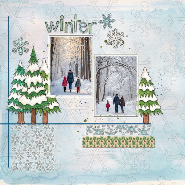 Olga’s serene stroll by a Wintery woods format makes use of a digital scrapbook template. There’s great giant snow lined timber beside the pictures, falling snowflakes, fake washi tapes and a refined snowflake and watercolor background. Take a look at the template and extra examples on the Kate Hadfield weblog.