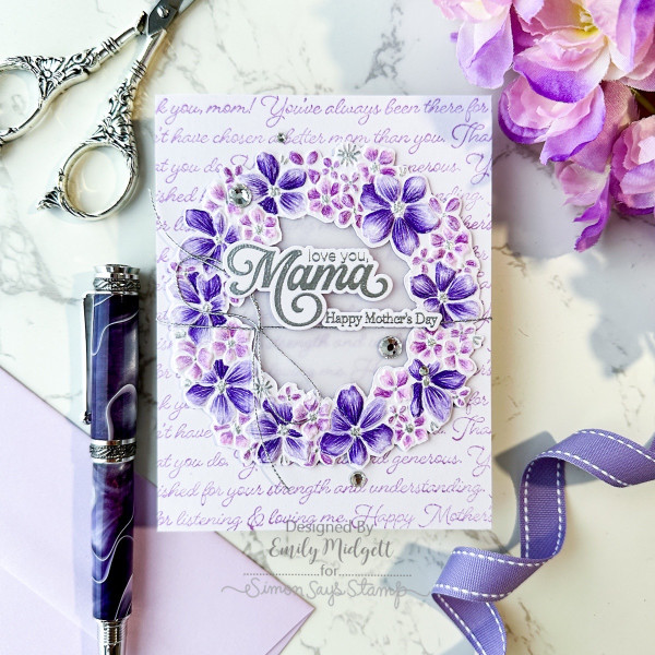 Emily’s heartfelt card for Mother has a fairly monochromatic purple coloration scheme. She used a dry embossing folder for the wreath and coloured it with coloured pencils and silver paint after which fussy lower it out, placing a silver warmth embossed sentiment on high. It’s positioned over vellum after which a card base with candy stamped sentiments. Discover extra information on the Sixth Avenue Sundries weblog.