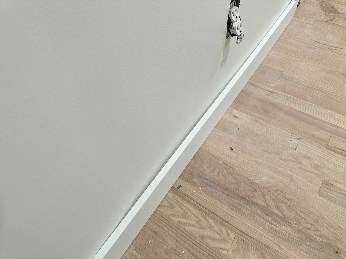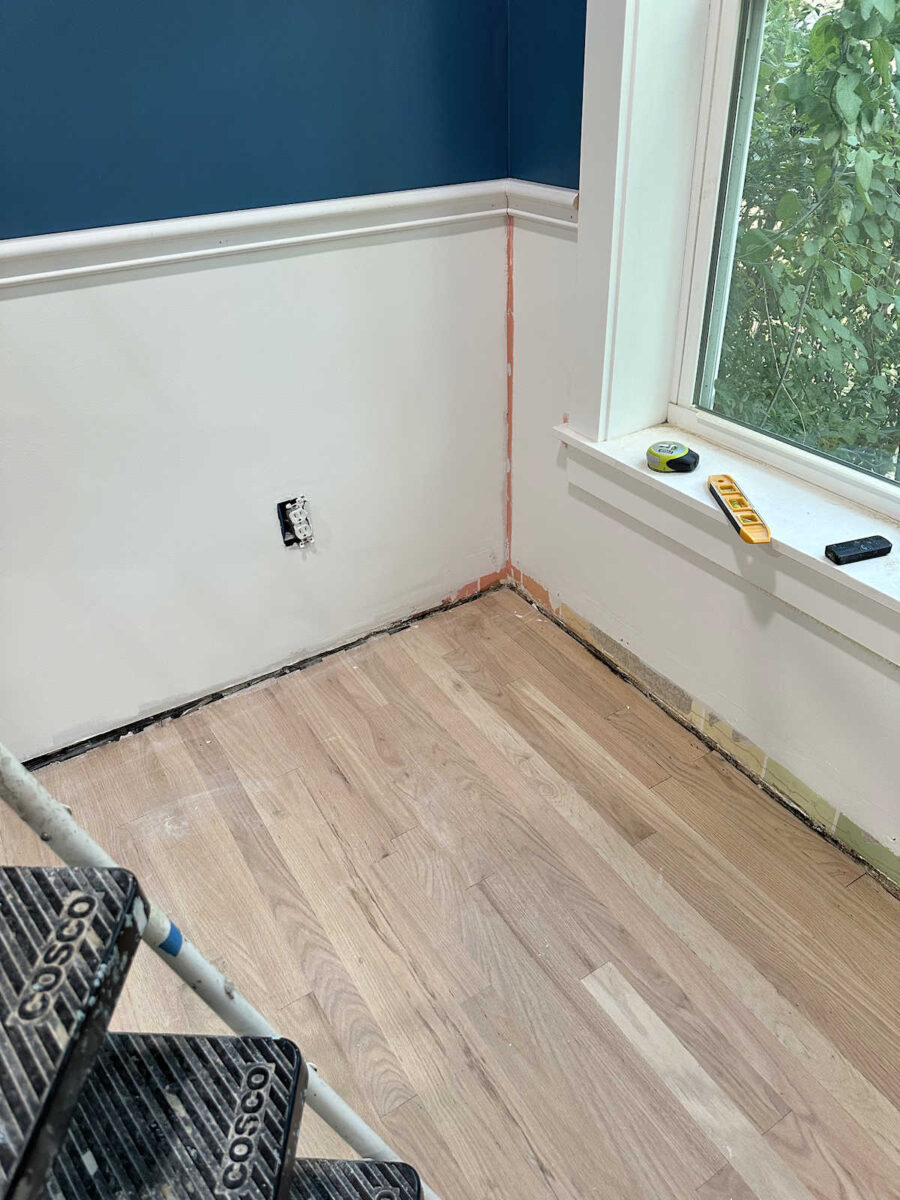 I imply, you’ll be able to see simply by taking a look at it that the baseboard trim goes up in the direction of the nook of the room. It’s very clearly not degree with the trim underneath the window. After all, there’s zero likelihood that the window is degree, so there shall be extra “splitting the distinction” required there as nicely.
