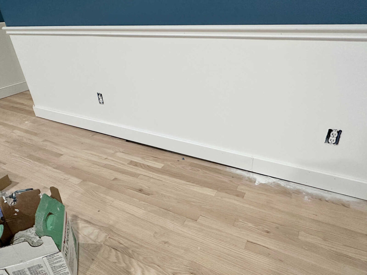 And the headboard wall is ok. Once more, I needed to take away and reinstall that trim numerous occasions, however I lastly received it trying fairly degree (splitting the distinction right here, and splitting the distinction there). However this wall shall be principally coated with draperies and a headboard anyway, so I’m not too involved.