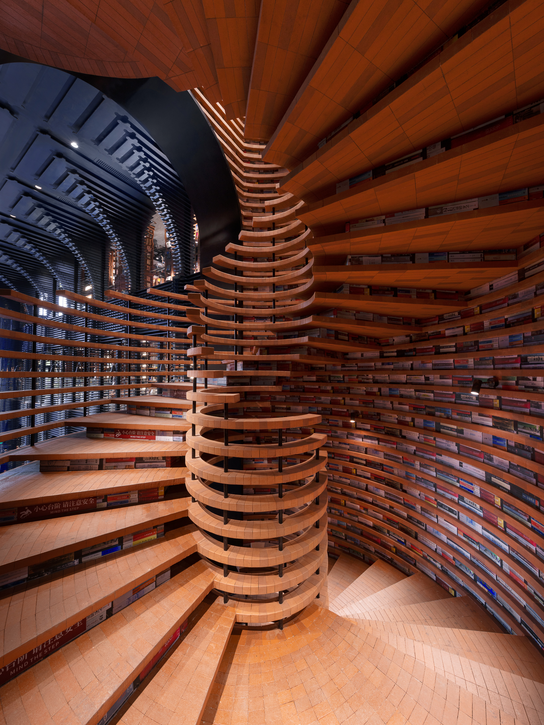 This bookstore chain has turned structure into its model. Each certainly one of Zhongshuge’s retailers is designed by X+LIVING, and collectively they kind a recognizable identification constructed from arches and labyrinth-like layouts. If you happen to step into any of their shops in Shanghai, Chengdu or Tianjin, you’ll know immediately the place you’re. This department ties that model language to its context. Set in Tianjin’s Italian-style district, it makes use of almost 400,000 customized pink bricks to kind sweeping arches, spirals and cabinets. Even earlier than you see the identify, the structure makes it clear you’ve entered Zhongshuge.