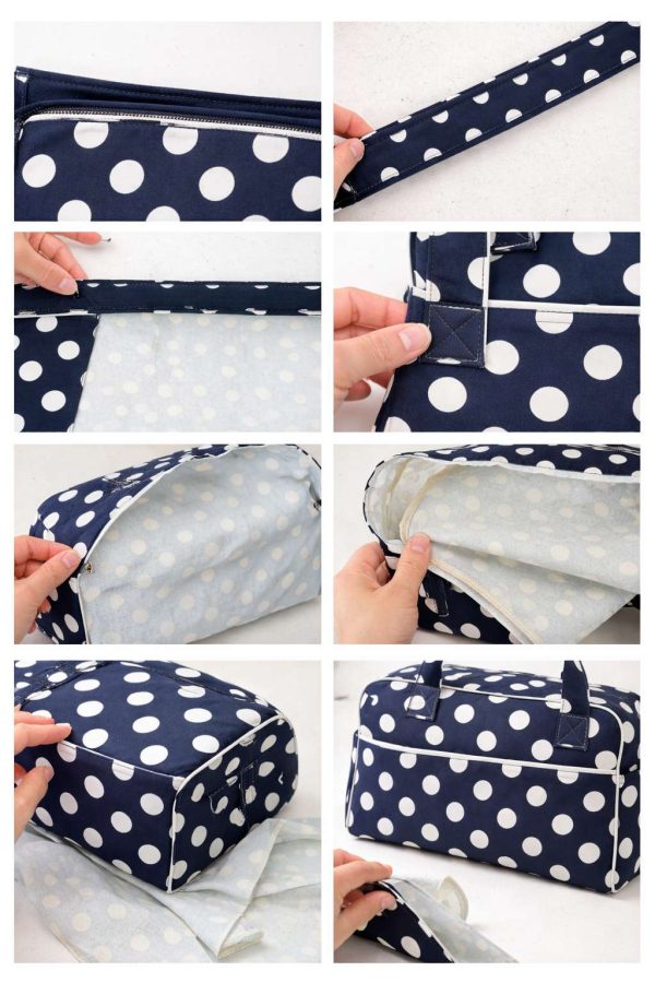 Polka dot material for the outer bag • Coordinating lining material • Fusible interfacing or foam stabiliser • One lengthy zipper (longer than the bag opening) • Matching thread • Pins or clips • Stitching machine • Iron