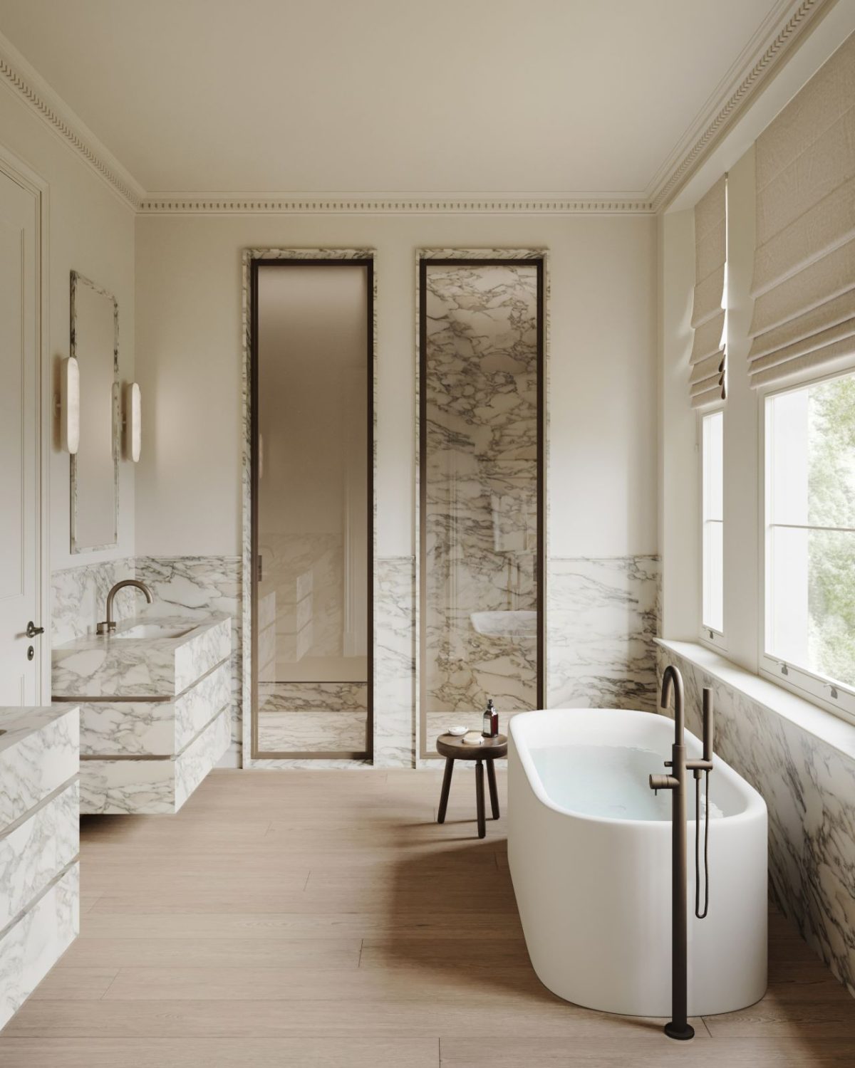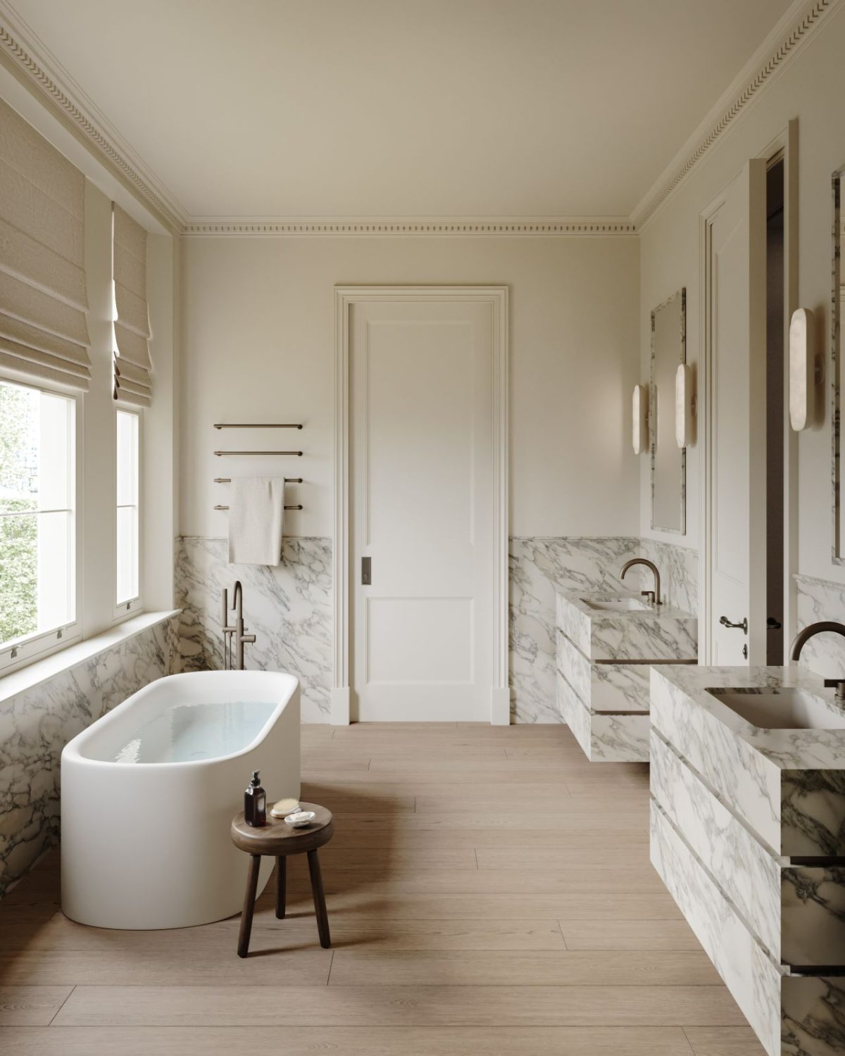 And you then get to the marble moments (sure, plural), that are truthfully a few of the most hanging options within the dwelling. The lavatory, specifically, leans into full materials immersion with marble surfaces that really feel luxurious however not flashy.