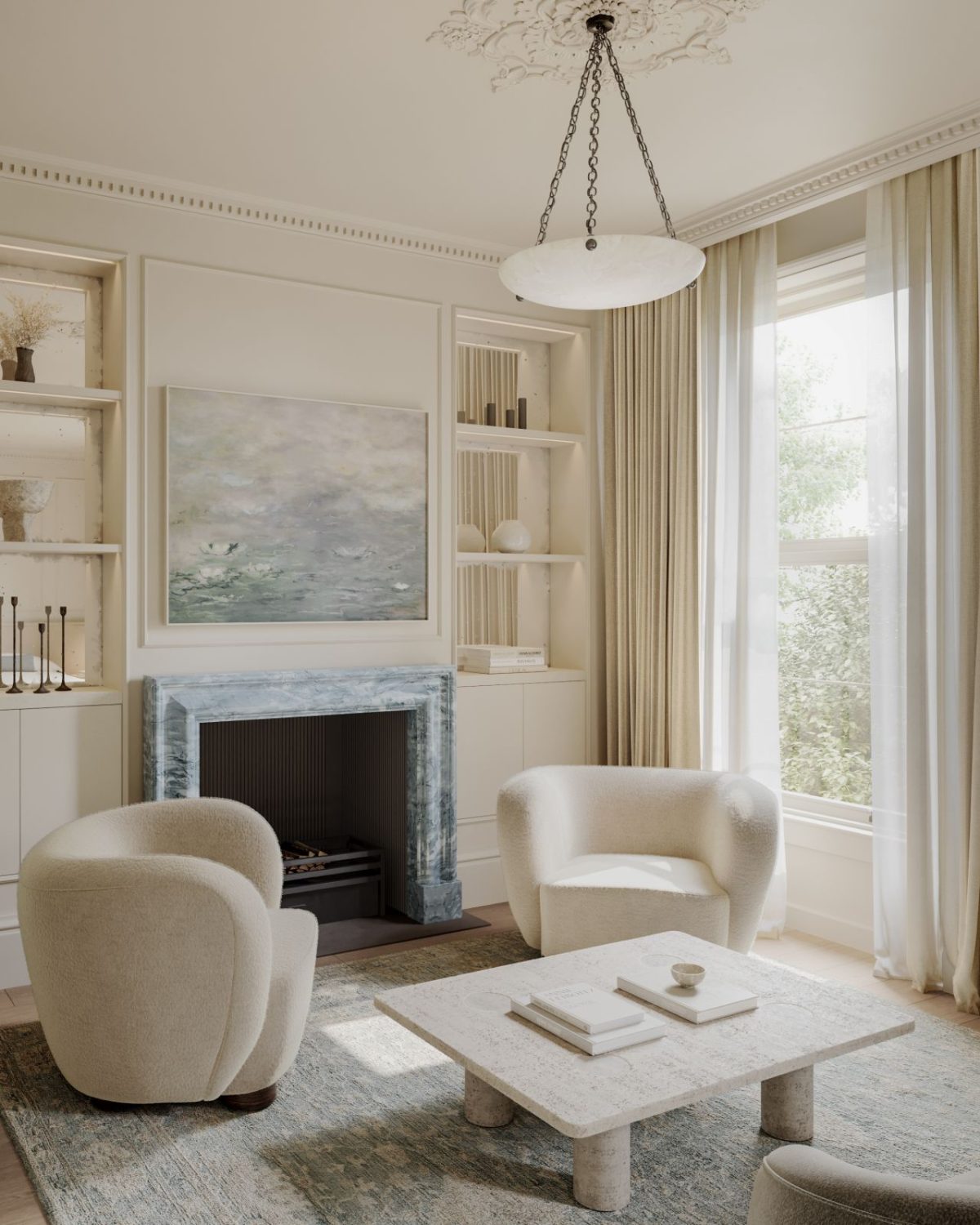 It’s this push and pull between softness and construction that makes the room really feel so layered. Even the marble hearth, with its ornate detailing, doesn’t really feel overly conventional—it’s grounded by the up to date furnishings selections round it.