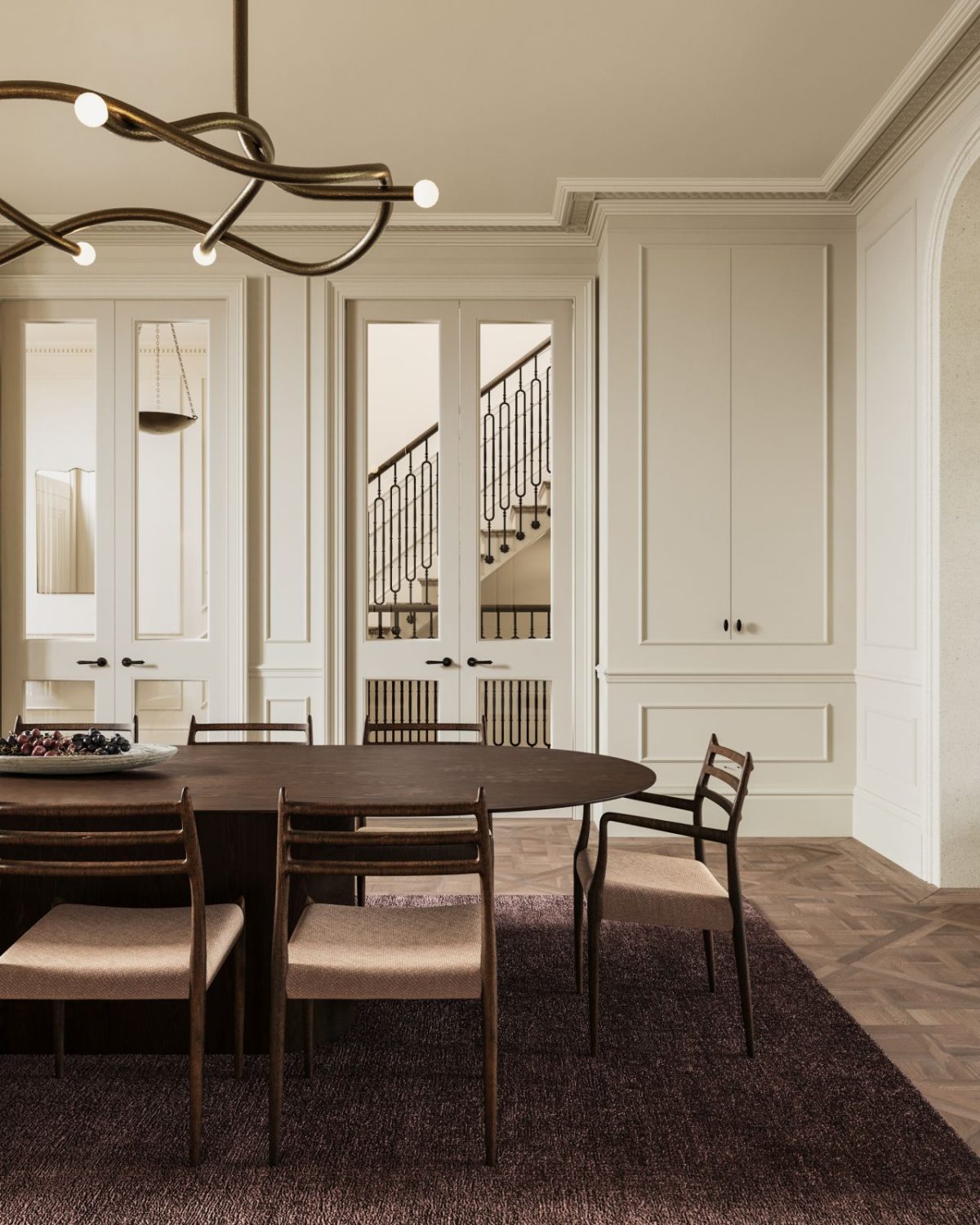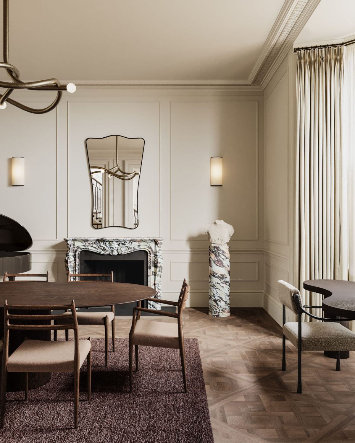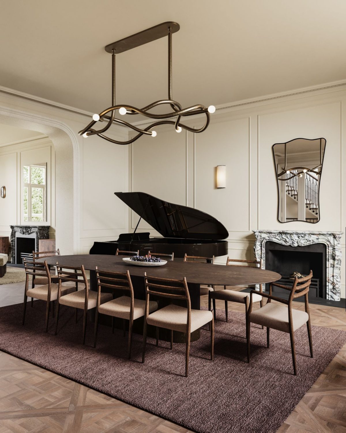 A ten-seat wood desk sits confidently on a darkish, textured rug, immediately anchoring the house. Round it, minimal chairs maintain issues mild, whereas the sculptural chandelier above provides motion (and truthfully, a little bit little bit of perspective).