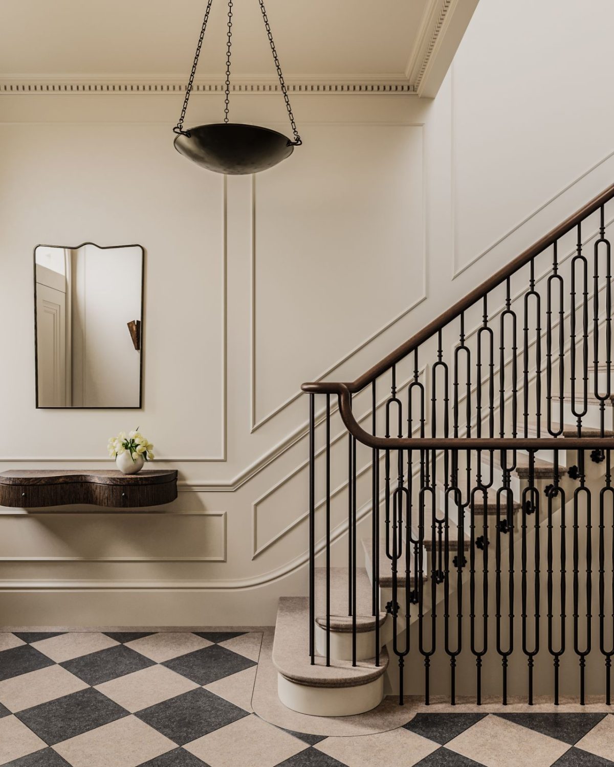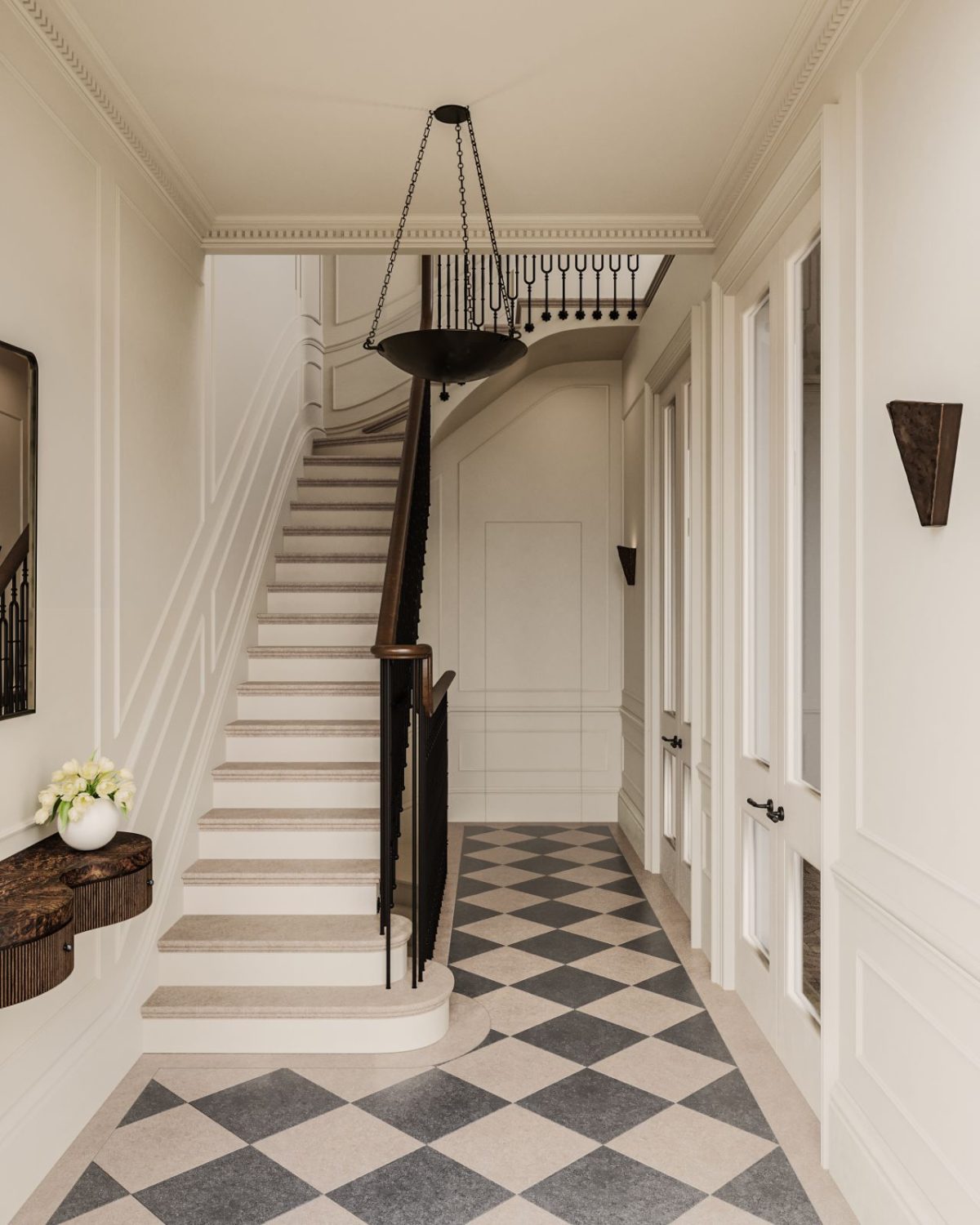 From the second you step into the doorway corridor, there’s a way that the whole lot is precisely the place it ought to be. The chequerboard stone flooring units the tone instantly—basic, graphic, however softened by the nice and cozy, creamy palette of the partitions and architectural detailing.