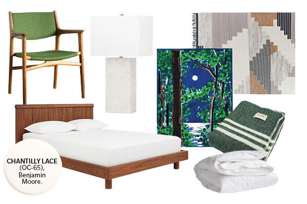 Jh-515 armchair by Hans J. Wegner for Johannes Hansen, $6,265. 1stDibs; Seismic Stone desk lamp by Troy Lighting for Hudson Valley Lighting, $688. Robinson Lighting & Tub; Moonrise 14 Hand-drawn Oil Pastel etching print, $1,400. Erik Olson; 6′ x 9′ Scandinavian Nordic Decor Bohemian-inspired rug by Himalayan Rugs Co, $728. Etsy; Queen Wool Striped blanket in Forest Inexperienced with Pure White, $150. MacAusland’s Woollen Mills; Queen Important 220 Thread Rely Percale quilt cowl in White, $300. Au Lit Effective Linens; Odeon queen mattress body in Basic Walnut, $2,995. Gus* Fashionable; Chantilly Lace (OC-65), Benjamin Moore.