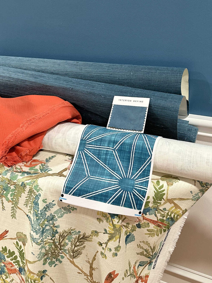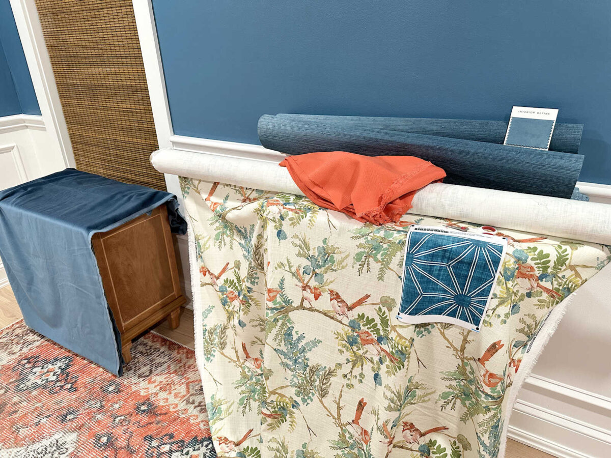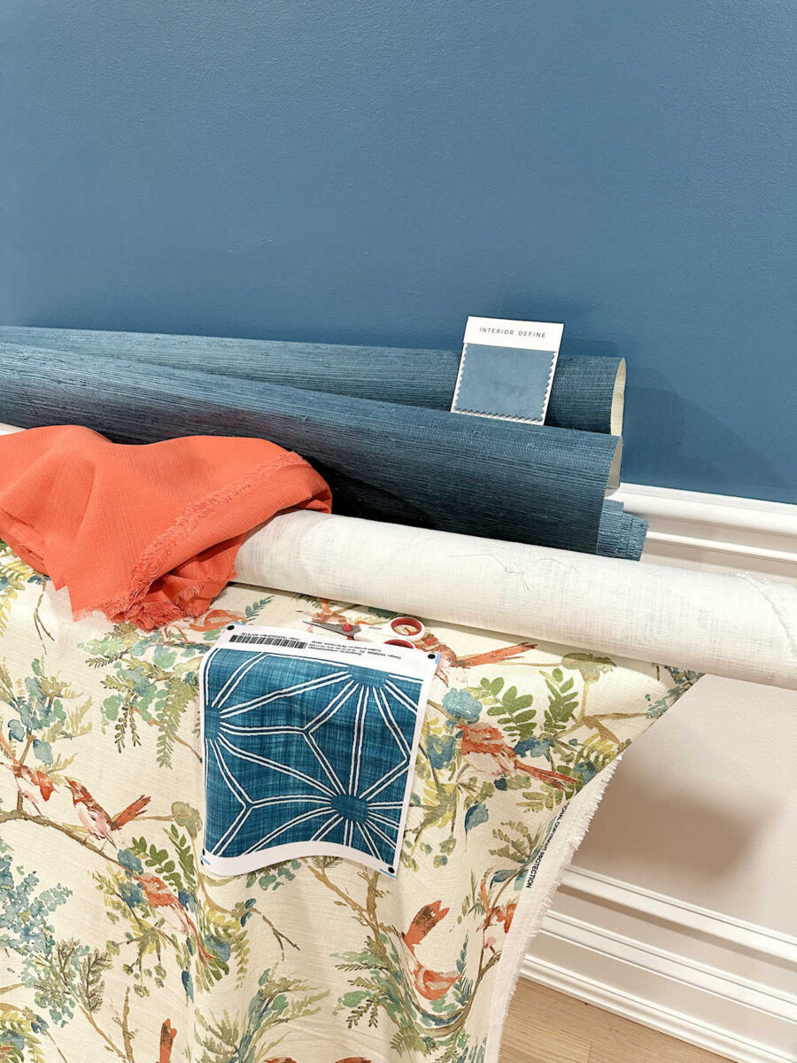 UPDATE: I acquired the samples, and I believe the one I had in thoughts would possibly work out completely. It’s bluer in individual than it appears within the mockup above. Right here’s what it appears like with every part else. I additionally introduced within the pattern of the recliner material. It’s the small velvet piece sitting on the grasscloth wallpaper.
