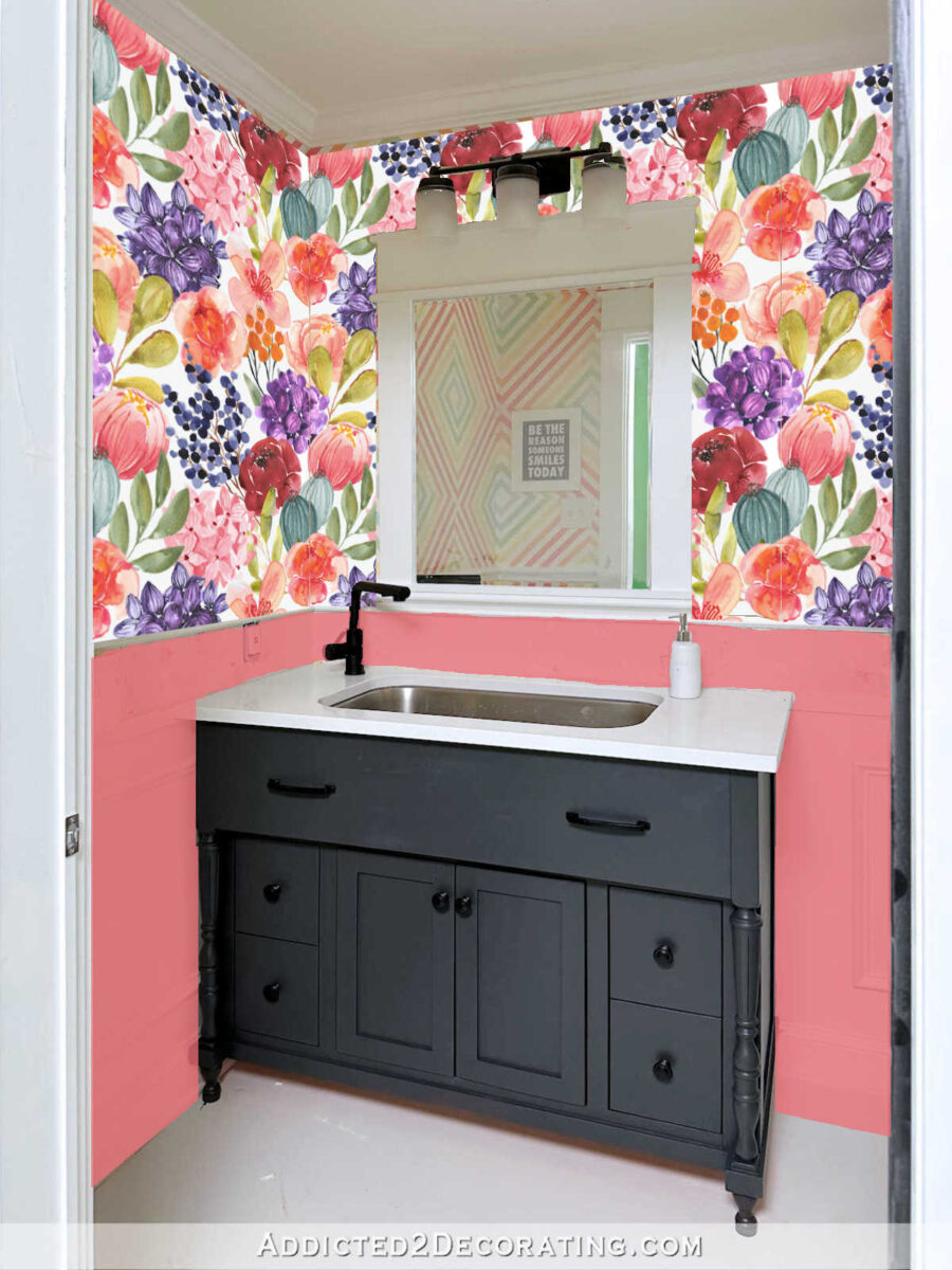 So I’ve now determined to have my floral wallpaper printed smaller (precise repeated wallpaper as an alternative of the bigger mural measurement that’s on the studio wall) and use that on the higher partitions within the toilet. I nonetheless haven’t selected the wainscoting colour. I did two mockups to check out two colours, after which I left one in all them white. You’ll need to ignore the reflection within the mirror, however right here’s what it would seems like with inexperienced wainscoting. I’d use the identical inexperienced that’s within the again entry of the studio.