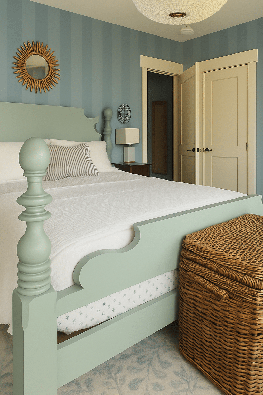 Stripes may make the room really feel cozy, layered, and a bit extra visually fascinating…particularly behind the mattress.