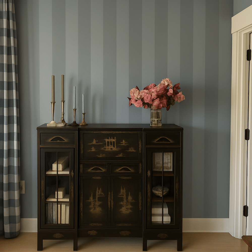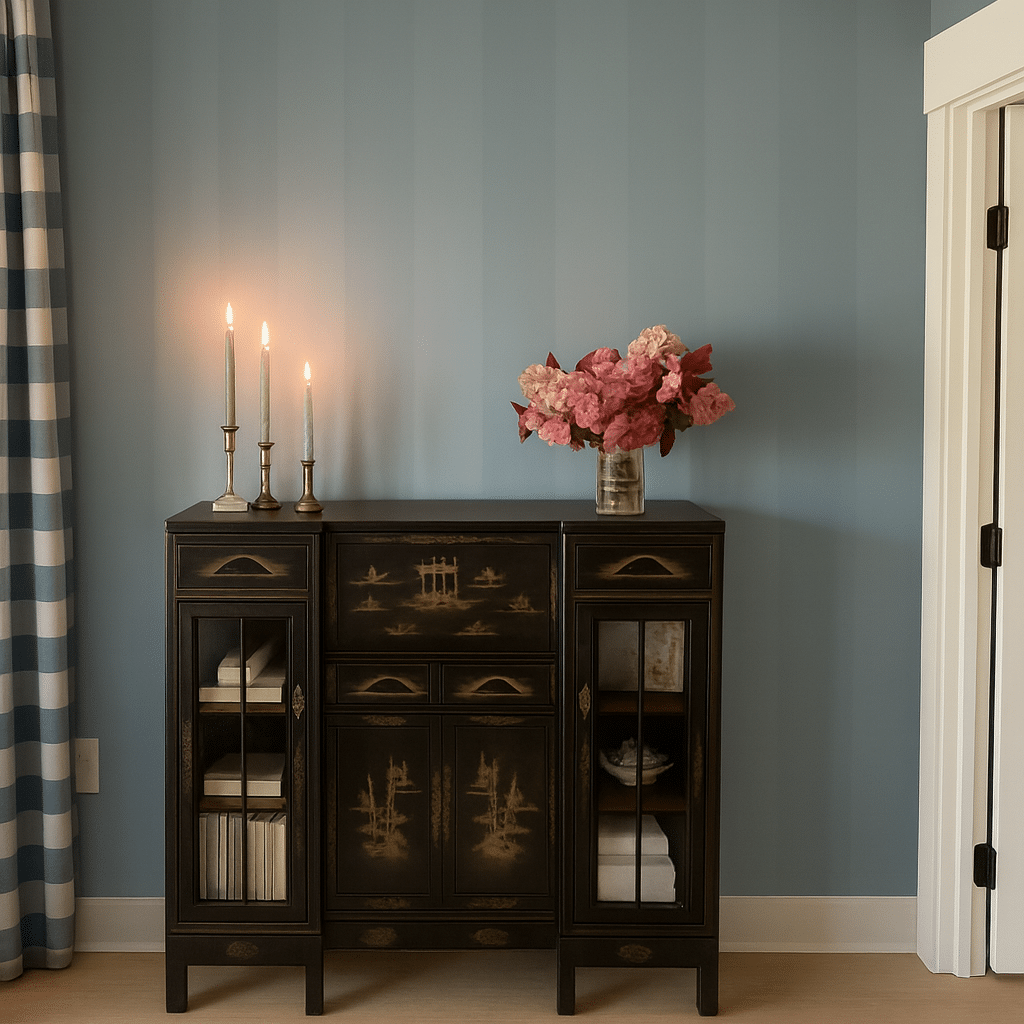 Oh! And I additionally requested what it could seem like if we swapped out our present chair for a black rattan one. I like the way it ties in with the black Chinoiserie cupboard we have already got —and makes our heirloom cupboard really feel extra intentional.