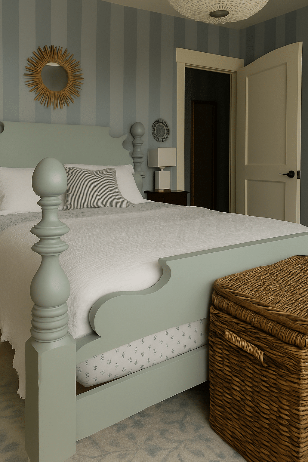I additionally thought of “Seashore Glass,” which we have already got in our front room. It’s such a soothing shade! I’m simply unsure if it could really feel completely different sufficient from the mattress, nevertheless it is perhaps price testing a swatch or two.