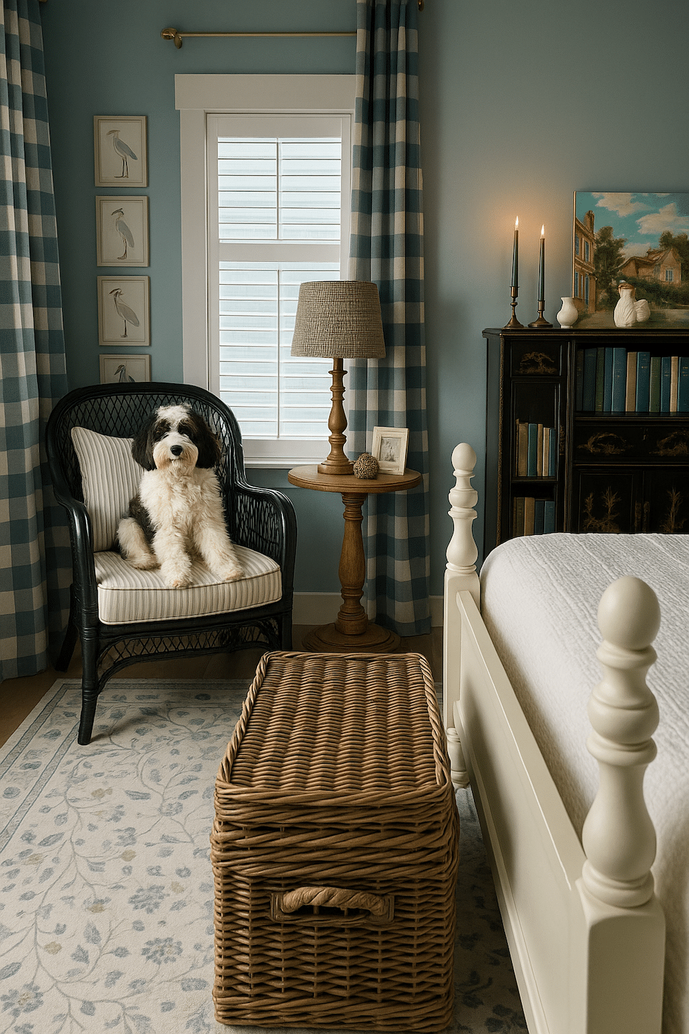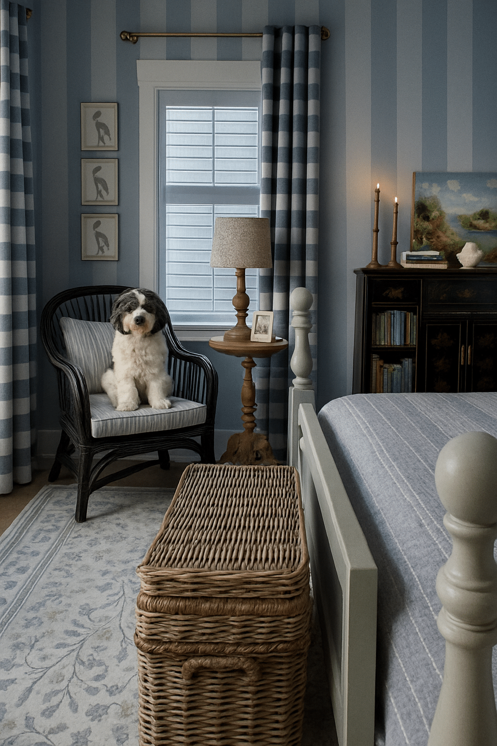 And right here’s a enjoyable experiment — we truly requested ChatGPT to point out us what the room would possibly seem like if it was a barely moodier shade of blue! It didn’t get my mattress shade fairly proper (and it made an entire new Finnegan ha), however nonetheless enjoyable to see and actually helps to visualise choices.