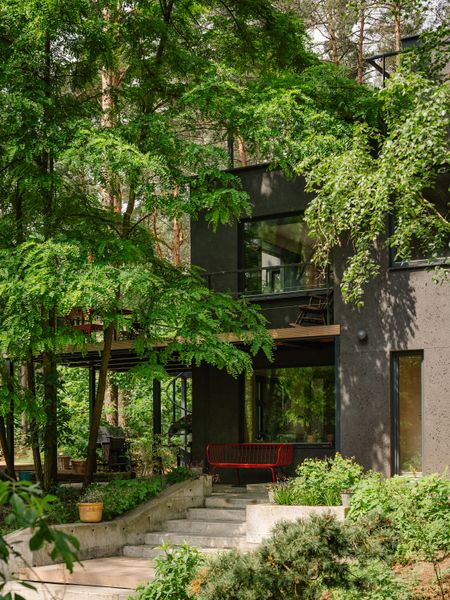 “Our objective was to discreetly disguise the house among the many timber and create a distinction between the camouflaged exterior and the heat of the eclectic inside. We proposed flooring skylights within the terrace to light up one of many visitor bedrooms and in the lounge to light up the hall on the bottom flooring. The constructing was to be as easy and subdued as potential. The home windows have been to draw consideration, with extra large metal frames and purple accents within the inside. The home was designed to lift the extent of the dwelling space and revel in a greater view: above the low floor flooring, the place there are two visitor bedrooms for the daughters, a examine and a rest room with a boiler room, there’s a kitchen with a eating space and a lounge with a further bathroom and a brand new terrace (the outdated one needed to be dismantled). Above, there may be the first bed room with a view of the forest and the river, a small lavatory, and two terraces.