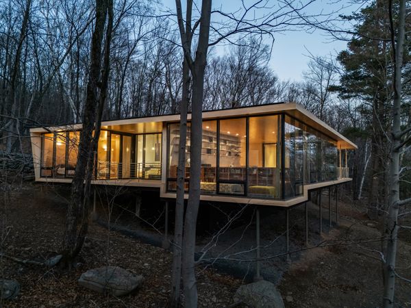 Michael Cooper and Ailsa Wong commissioned GLUCK+ to design a low-impact Catskills house that feels prefer it’s floating within the forest. The house’s stained pine exterior blends in with the tree trunks, whereas its inside liner provides a way of the heat that awaits inside. The couple discovered a bit of lichen on-site and had the house’s columns shade matched to it.